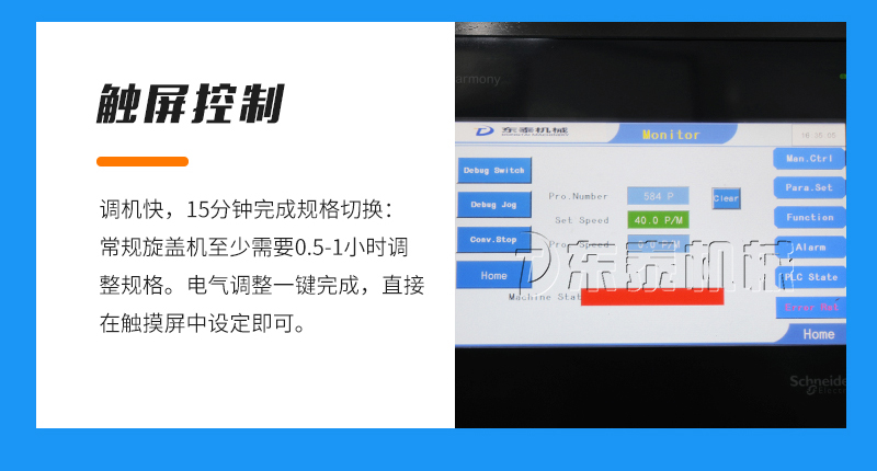 7、調(diào)機快,15分鐘完成規(guī)格切換:常規(guī)旋蓋機至少需要0.5-1小時調(diào)整規(guī)格。