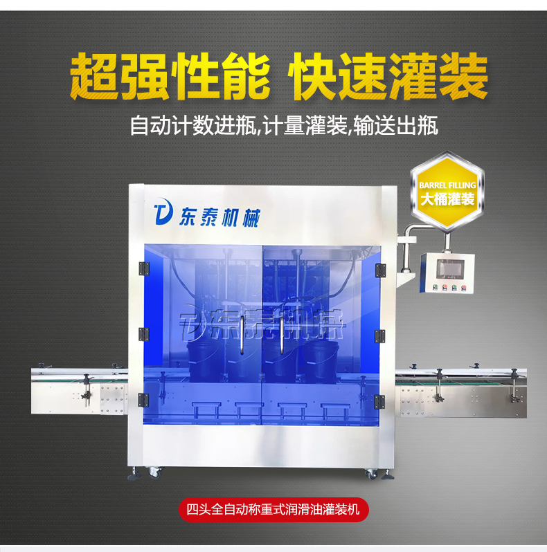 機(jī)油灌裝機(jī)適用于對4kg-25kg汽車用品類產(chǎn)品:潤滑油、防凍液、車用尿素等液體灌裝。自動完成計(jì)數(shù)進(jìn)瓶、計(jì)重量灌裝、輸送出瓶等一系列操作。 特別適用于潤滑油、水劑、食用油的定量灌裝,是食品,醫(yī)藥,化妝品以及精細(xì)化工等行業(yè)的理想灌裝機(jī)。本機(jī)采用可編程控制器(PLC)、高速工控組態(tài)軟件進(jìn)行實(shí)時(shí)監(jiān)控的控制,使用調(diào)節(jié)方便。整機(jī)按GMP標(biāo)準(zhǔn)要求制作,各管路連接采用快裝方式,拆卸清洗方便,與物料接觸部位及外露部位均采用不銹鋼制造。整機(jī)安全、環(huán)保、安全、美觀、能適應(yīng)各種不同環(huán)境工作。