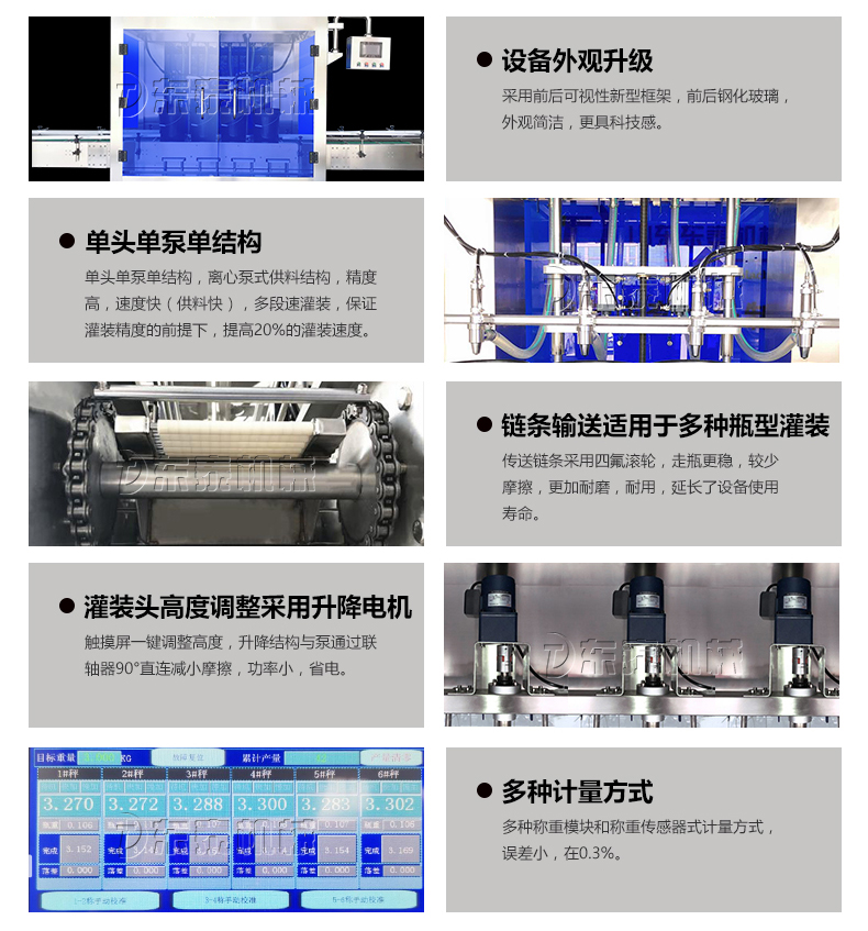 6、采用獨(dú)特的軟硬件設(shè)計(jì),可有效的防止物料滴漏,保證灌裝設(shè)備及包裝容器的清潔。