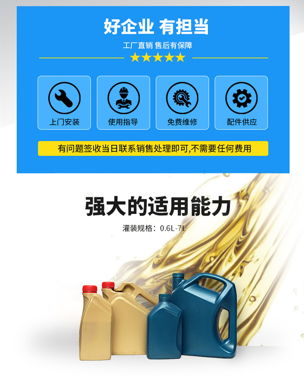 600KG,內(nèi)部設(shè)有阻擋板,避免油品輸入過程油品外冒,同時(shí)保證灌裝精度;儲油箱位置設(shè)在灌裝機(jī)頂部,自帶可視液位計(jì),頂部箱蓋大包圍設(shè)計(jì)并且可以打開,具備排氣功能(排出氣泡等);灌裝頭整體上升方式平穩(wěn),不產(chǎn)生震動,高度及寬度可調(diào)。