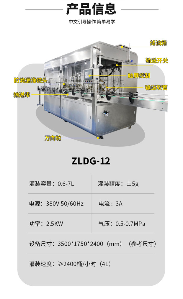 含高位罐,高頻多段灌裝速度隨意調(diào)整灌裝機(jī)操作程序優(yōu)化,可存儲40組以上的配方參數(shù)。