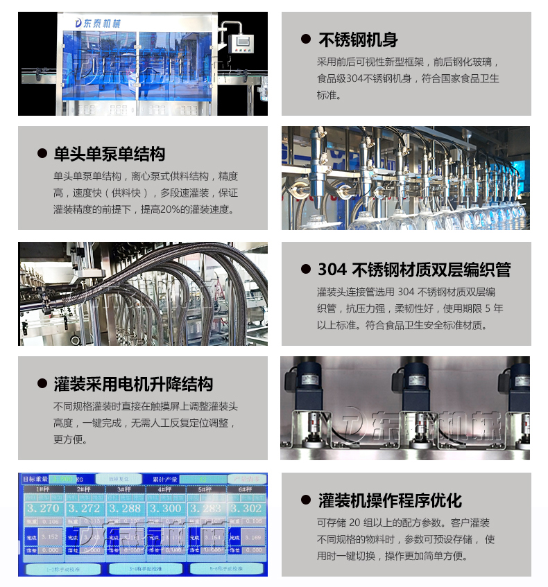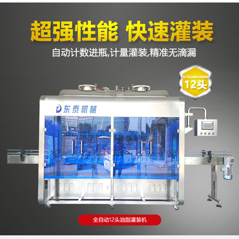 這款油脂灌裝機能夠適用多種流體5kg-30kg的計重量灌裝。自行完成計數(shù)進瓶、計重量灌裝、輸送出瓶等一系列的智能操作。 特別是適用于水劑、食用油,潤滑油的定量灌裝,是食品,醫(yī)藥,化妝品以及精細化工等多個行業(yè)的包裝機。本機采用的是編程控制器(PLC)、高速工控組態(tài)軟件進行實時監(jiān)控的控制,使用調(diào)節(jié)更加的方便。整機是按GMP標準要求制作的,各管路連接采用快裝方式,拆卸清洗方便,與物料接觸部位及外露部位均采用了優(yōu)質(zhì)不銹鋼制造