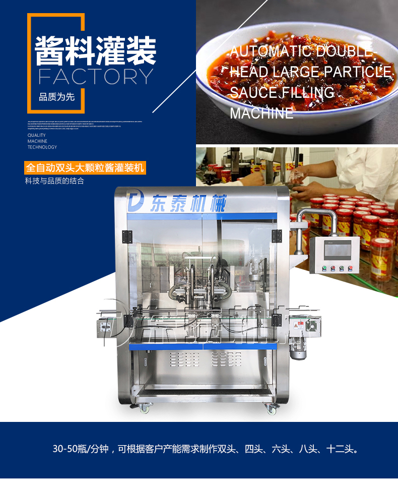 醬料行業(yè)市場日趨龐大,有非常的工作效率,來滿足客戶需求就顯的十分重要了,我們公司便能給您帶來這種的幫助,這款辣椒醬灌裝機灌裝機身為公司新生產(chǎn)制造的灌裝機在行業(yè)市場上發(fā)揮了重要的作用,辣椒醬灌裝機是集光,機,電,氣于一體,選用活塞式定量原理,灌裝精確度高,使用比較簡單,維護非常方便,設(shè)備主要材質(zhì):選用SUS3