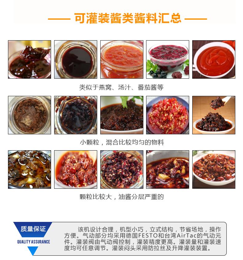 身為公司新生產(chǎn)制造的灌裝機在行業(yè)市場上發(fā)揮了重要的作用,是集光,機,電,氣于一體,選用活塞式定量原理,灌裝精確度高,使用比較簡單,維護非常方便,設(shè)備主要材質(zhì):辣椒醬灌裝機選用SUS304不銹鋼制造,衛(wèi)生指標要求.灌裝環(huán)節(jié)選用亞克力透明板與外部隔離,確保灌裝的衛(wèi)生要求。灌裝選用壓力式灌裝,無須配裝高位罐,簡易化了組裝工序,提高了灌裝工作效率??善毡槭褂糜谑称?、醬料制造業(yè)設(shè)備的自動化包裝生產(chǎn)制造