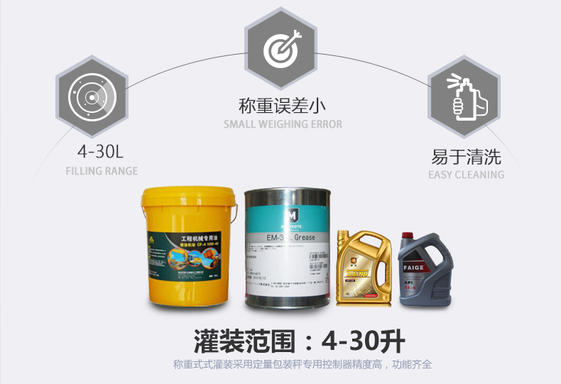 機(jī)油灌裝機(jī)適用于對4kg-25kg汽車用品類產(chǎn)品:潤滑油、防凍液、車用尿素等液體灌裝。自動完成計(jì)數(shù)進(jìn)瓶、計(jì)重量灌裝、輸送出瓶等一系列操作。 特別適用于潤滑油、水劑、食用油的定量灌裝,是食品,醫(yī)藥,化妝品以及精細(xì)化工等行業(yè)的理想灌裝機(jī)。本機(jī)采用可編程控制器(PLC)、高速工控組態(tài)軟件進(jìn)行實(shí)時(shí)監(jiān)控的控制,使用調(diào)節(jié)方便。整機(jī)按GMP標(biāo)準(zhǔn)要求制作,各管路連接采用快裝方式,拆卸清洗方便,與物料接觸部位及外露部位均采用不銹鋼制造。整機(jī)安全、環(huán)保、安全、美觀、能適應(yīng)各種不同環(huán)境工作。